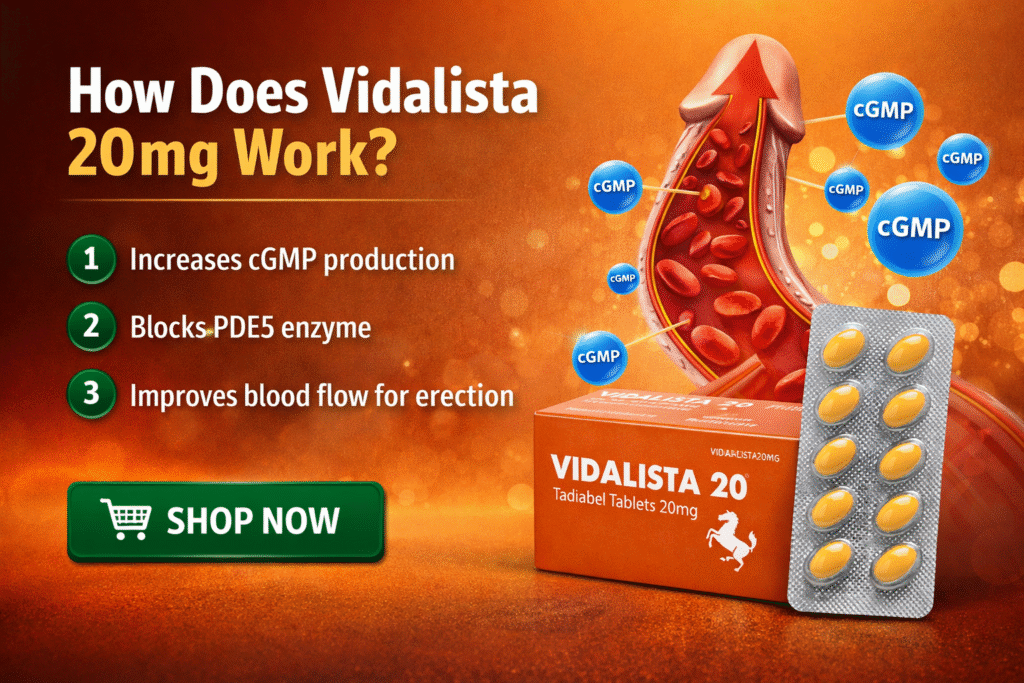 Vidalista 20 mg works by blocking the PDE5 enzyme, increasing cGMP levels, relaxing blood vessels, and improving blood flow to the penis. This results in a strong and natural erection when combined with sexual stimulation.